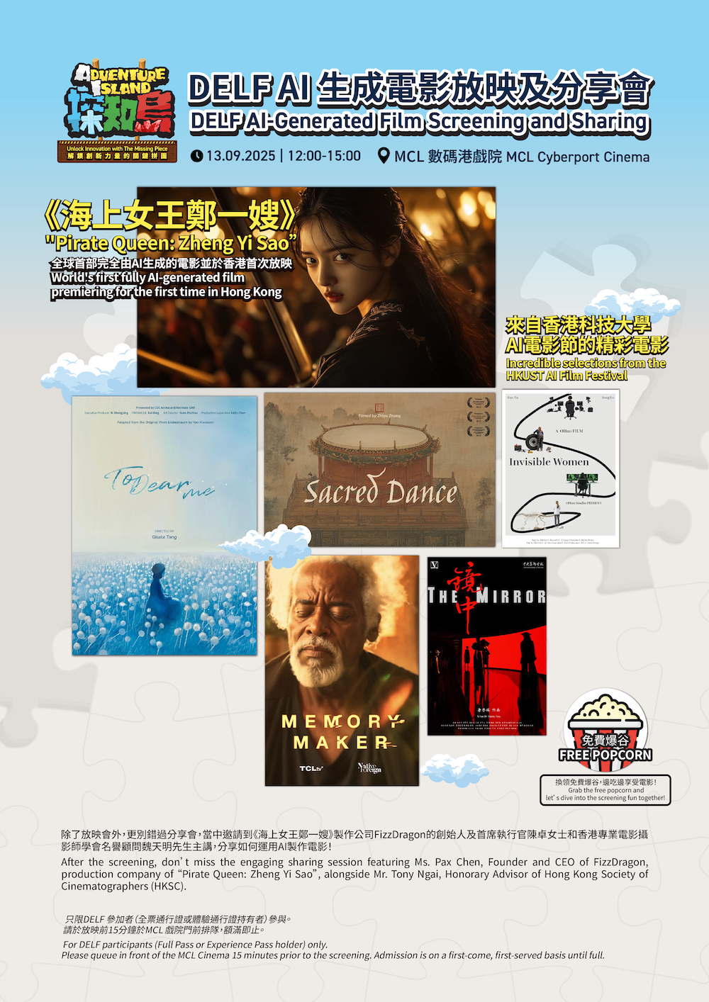 我们精选了全球首部完全由AI生成的电影《海上女王郑一嫂》 ,将於香港首播,并展示来自香港科技大学AI电影节的五部精彩电影。 除了放映会外,更别错过分享会,当中邀请到《海上女王郑一嫂》 製作公司FizzDragon创始人及首席执行官陈卓女士和香港专业电影摄影师学会名誉顾问魏天明先生主讲,分享如何透过AI 製作电影!